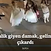 Bursa'da gelinlik giyinen damat görenleri hayrete düşürdü. Damadın gelinlikle oynadığı o anlar kameraya yansırken, geline taş çıkartması dikkat çekti.